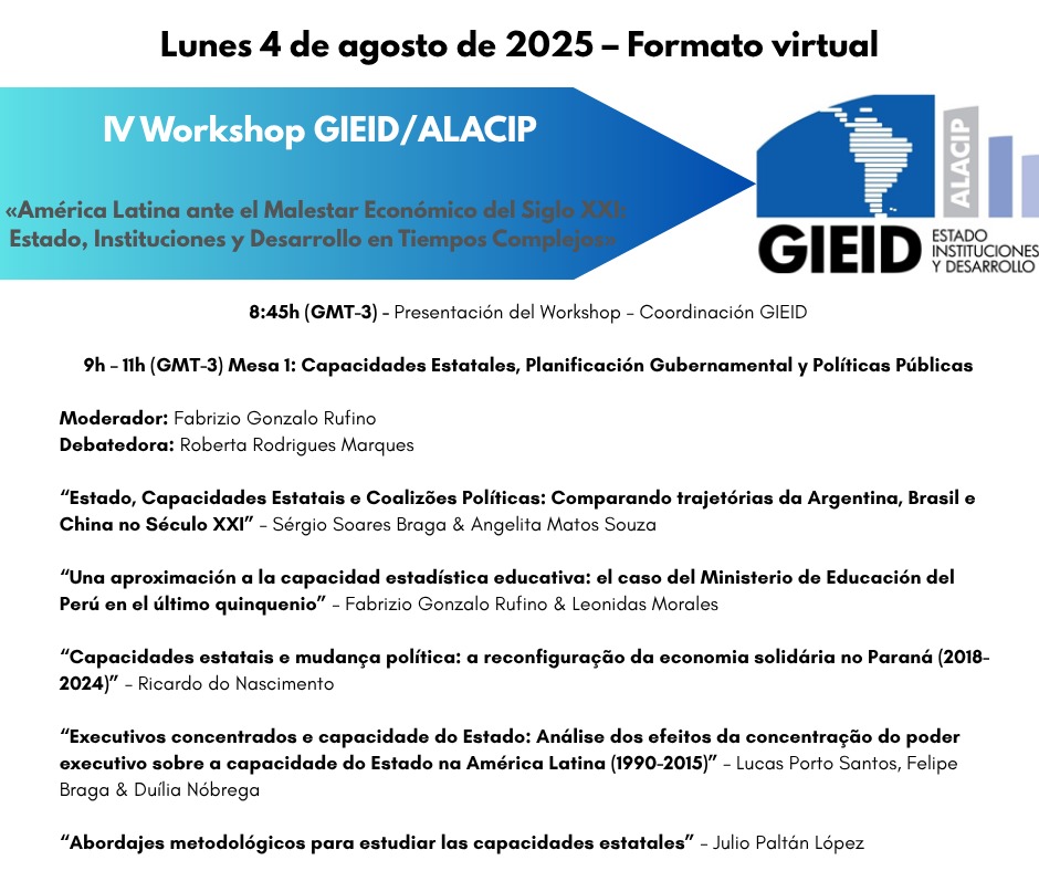 [ESP] El Grupo de Investigación Estado, Instituciones y Desarrollo de la Asociación Latinoamericana de Ciencia Política (GIEID-ALACIP) difunde a todos/as la Programación de su IV WORKSHOP, bajo el título “AMÉRICA LATINA ANTE EL MALESTAR ECONÓMICO DEL SIGLO XXI: ESTADO, INSTITUCIONES Y DESARROLLO EN TIEMPOS COMPLEJOS”, que se realizará el día 4 de agosto de 2025, exclusivamente en formato virtual a través de la Plataforma Zoom. La programación puede consultarse a continuación. Los trabajos presentados serán compilados en un Ebook del Grupo, que será publicado a finales del año.