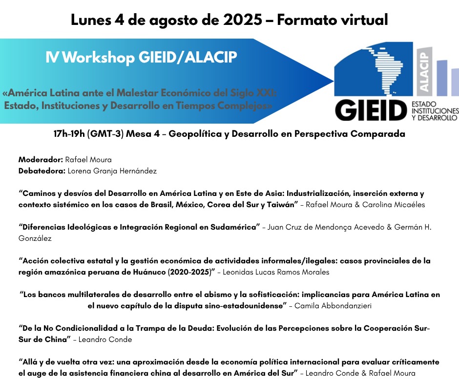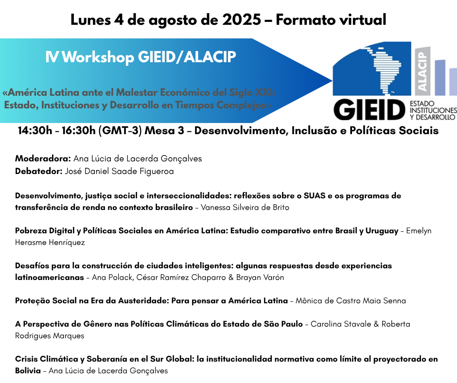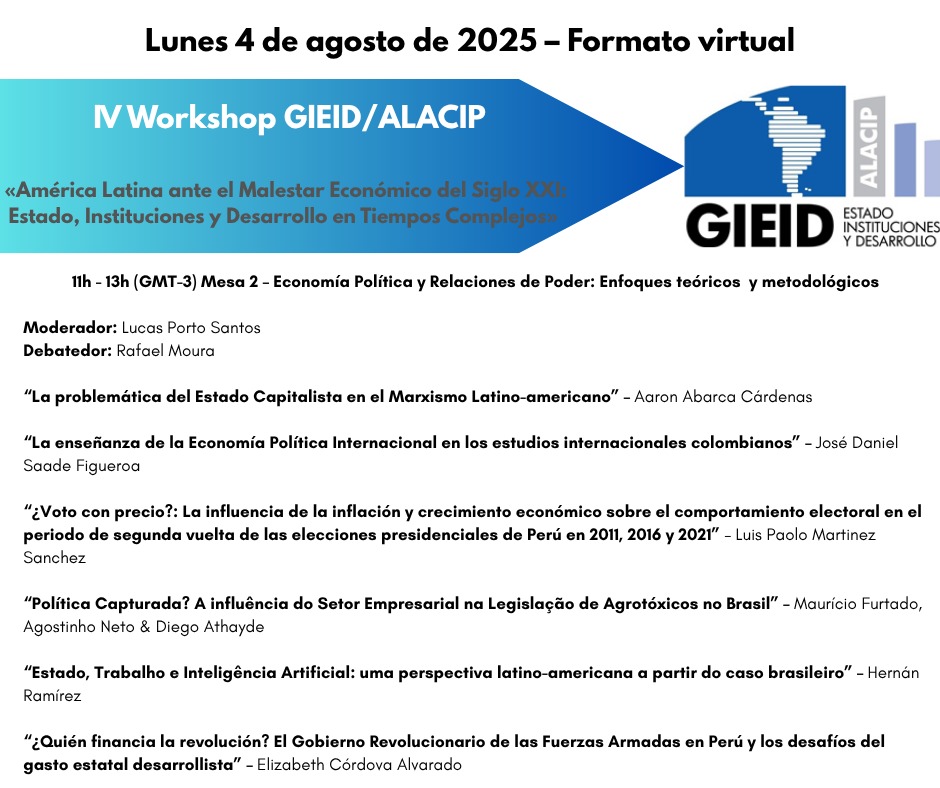 [PORT] O Grupo de Pesquisa Estado, Instituições e Desenvolvimento da Associação Latino-Americana de Ciência Política (GIEID-ALACIP) divulga a todos a Programação de seu IV WORKSHOP, sob o título «A AMÉRICA LATINA DIANTE DO MAL-ESTAR ECONÔMICO DO SÉCULO XXI: ESTADO, INSTITUIÇÕES E DESENVOLVIMENTO EM TEMPOS COMPLEXOS», que será realizado no dia 4 de agosto de 2025, exclusivamente no formato virtual através da Plataforma Zoom. A programação pode ser consultada abaixo. Os trabalhos apresentados serão compilados em um Ebook do Grupo, lançado ao final do ano.